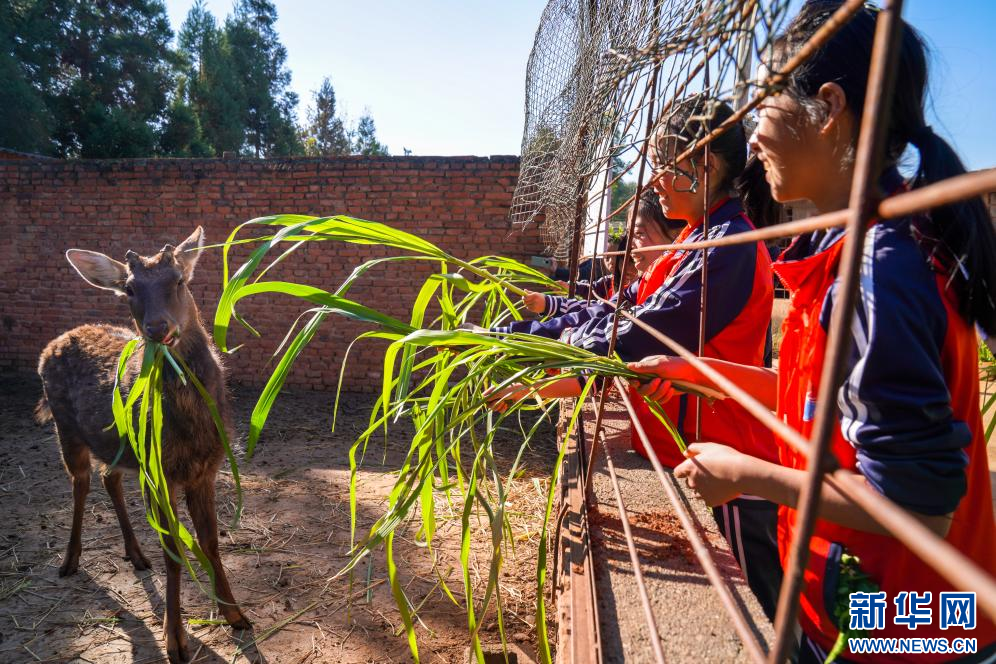 11月15日,靖外明德小学的劳动课上,学生在喂梅花鹿。新华社发(彭奕凯 摄)
