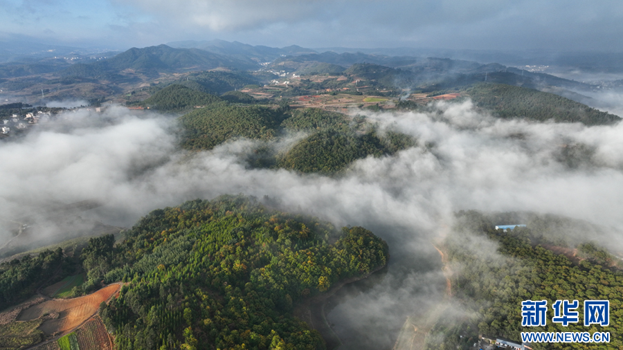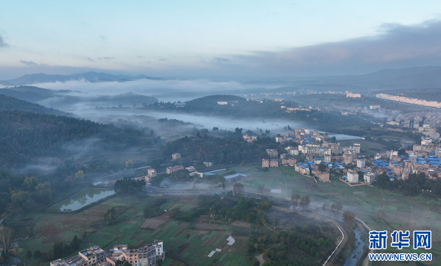 山林、湖水、田地、民居好像披上一层轻纱(11月30日摄)。新华网发(孙文来 摄)