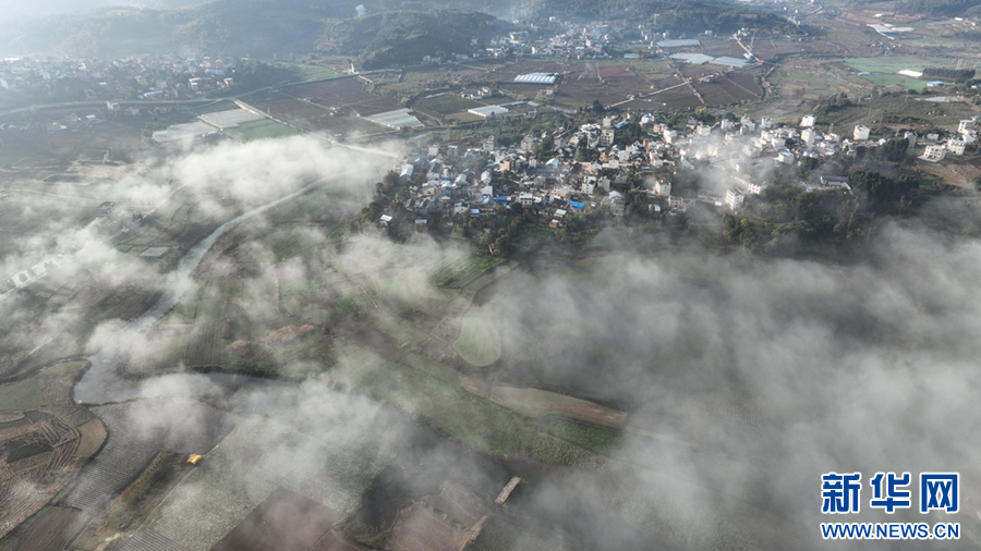 云雾下的民居、田地(11月30日摄)。新华网发(孙文来 摄)