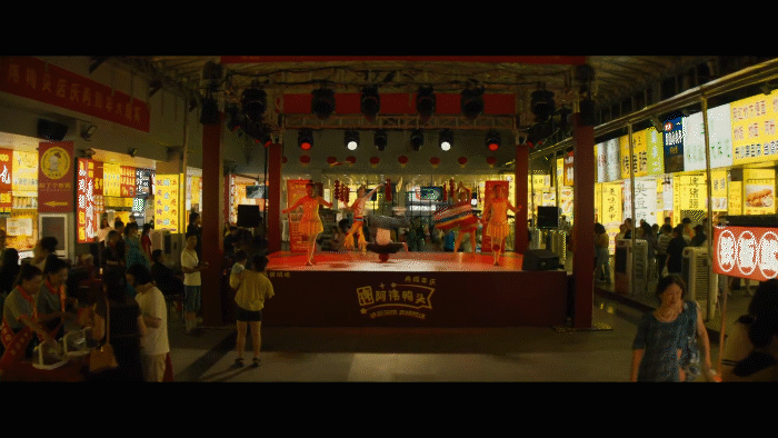 在“阿伟鸭头”的开业仪式上卖艺助阵的场景