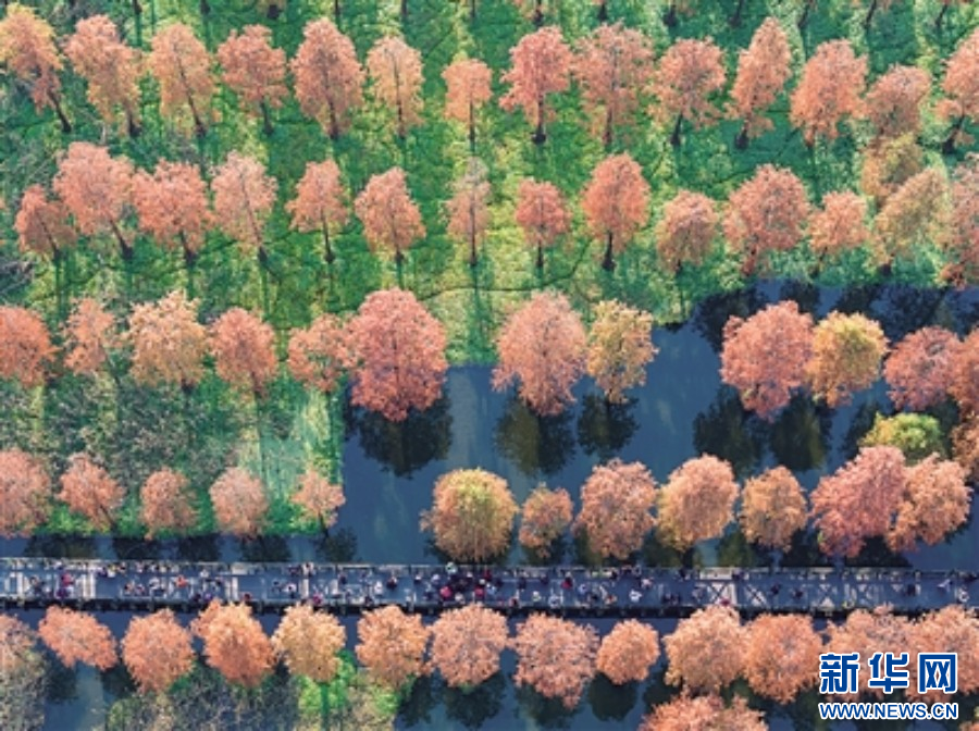 游客在上海青西郊野公园的水上森林欣赏美景(资料图)。新华网发(王须中 摄)