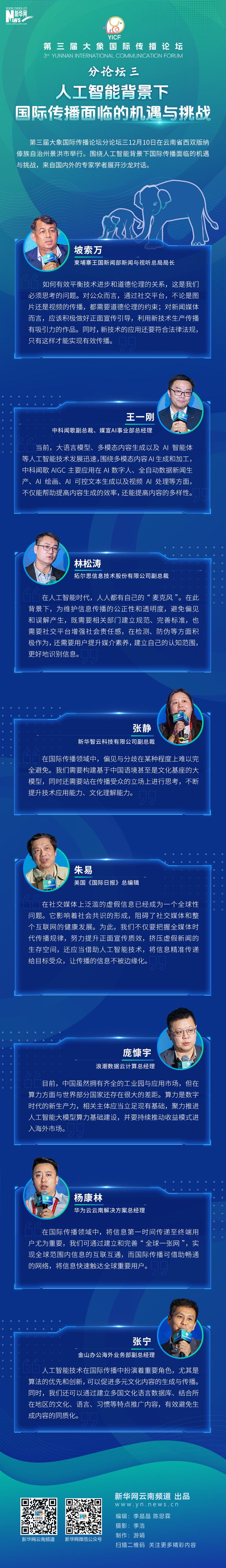 第三届大象国际传播论坛分论坛三12月10日在云南省西双版纳傣族自治州景洪市举行。围绕人工智能背景下国际传播面临的机遇与挑战,来自国内外的专家学者展开沙龙对话。