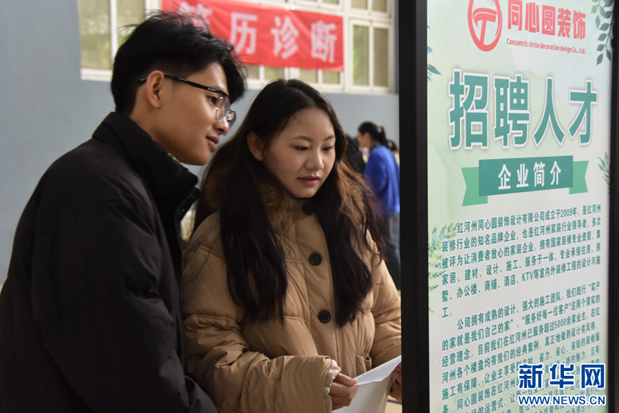 12月13日,在红河学院专场招聘会上,求职者在查看岗位信息。新华网发(薛莹莹 摄)
