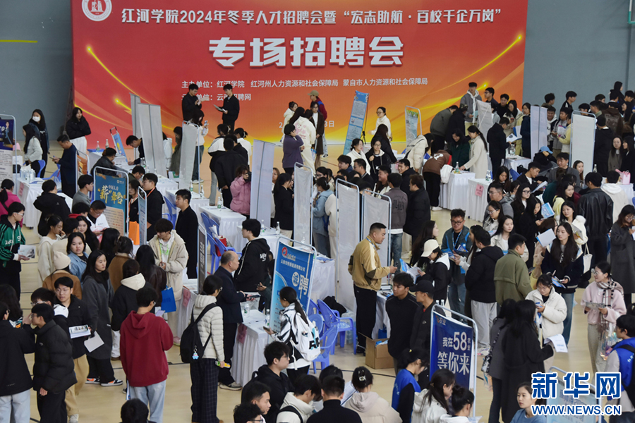 近日,红河学院2024年冬季人才招聘会暨“宏志助航·百校千企万岗”专场招聘会在红河学院举行。本次招聘会吸引了来自山东、江苏、福建、广东、上海、云南等6个省市的103家用人单位参加,提供涵盖农林、采矿业、教育业、金融业、制造业、公共管理、媒体、零售业、物流仓储业等多个热门行业239个岗位,吸引了近3000余名同学前来参加。据悉,招聘单位共收到简历2224份,221名毕业生与用人单位达成初步签约意向。新华网发(薛莹莹 摄)