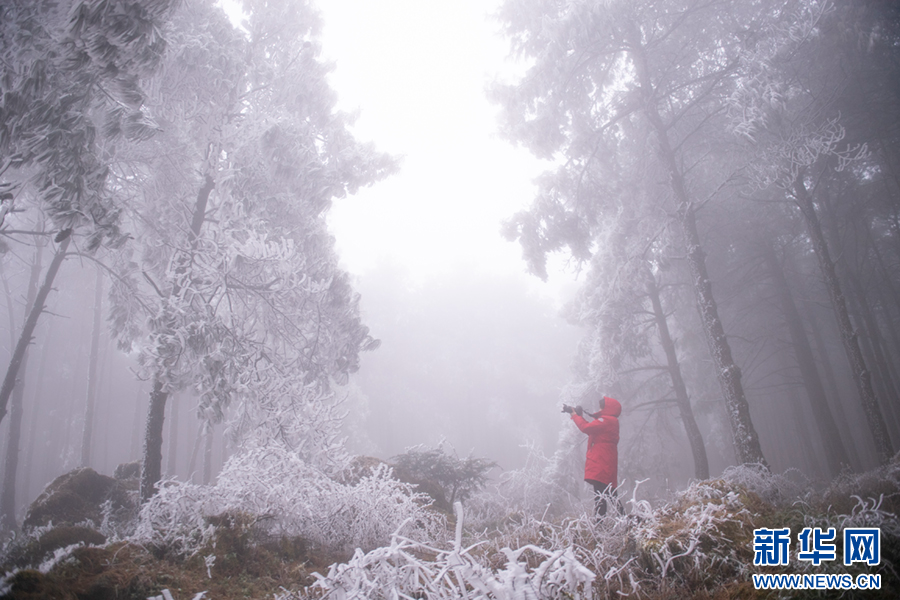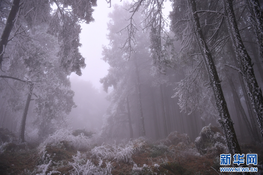近日,摄影师在云南省文山壮族苗族自治州丘北县舍得彝族乡舍得草场拍摄到美丽的雾凇景观。在银装素裹的山林间,松树的枝干和针叶上挂满了冰凌,身处其间,可以看到树林里弥漫着阵阵雾气,宛如走进了童话世界。新华网发(熊平祥 摄)