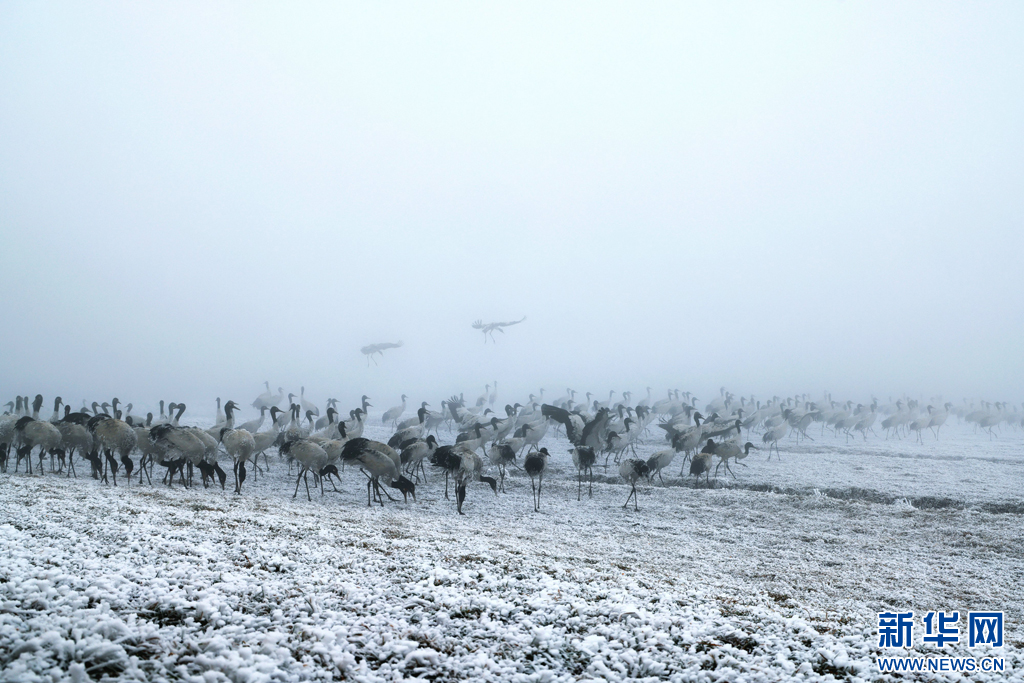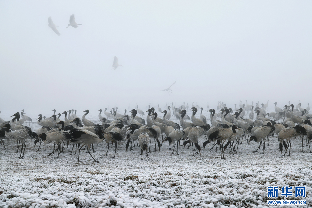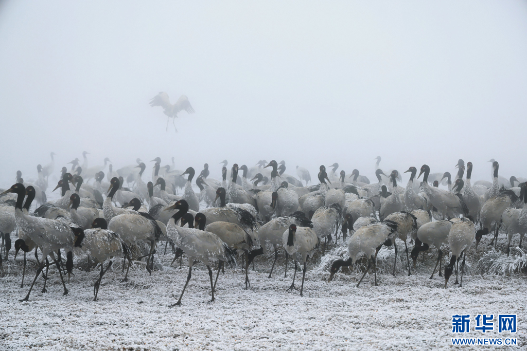 冰雾中的黑颈鹤(12月15日摄)。新华网发(郑远见 摄)