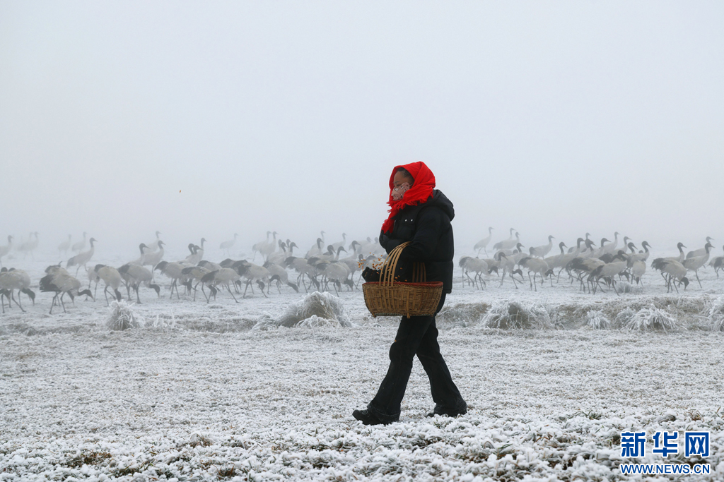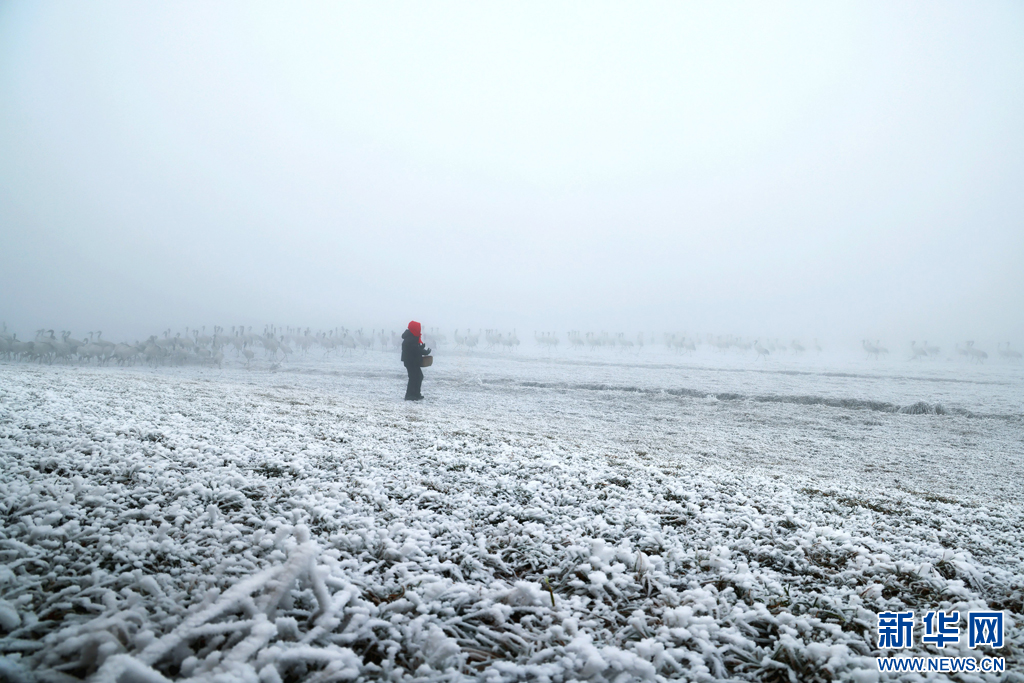 护鹤员与冰雾中的黑颈鹤(12月15日摄)。新华网发(郑远见 摄)