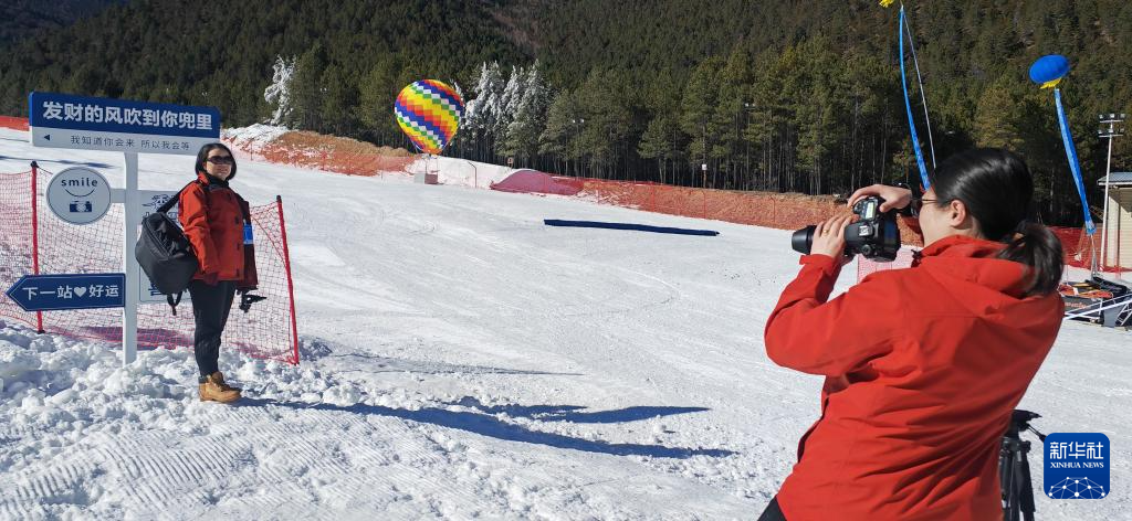 12月28日,游客在云南省迪庆州香格里拉市的七星雪滑雪场拍照留念。新华社记者 浦超 摄