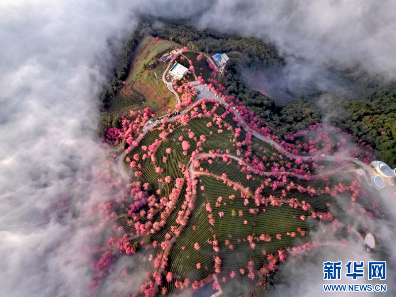 航拍云雾缭绕的樱花谷(1月1日摄)。新华网发(适志宏 摄)