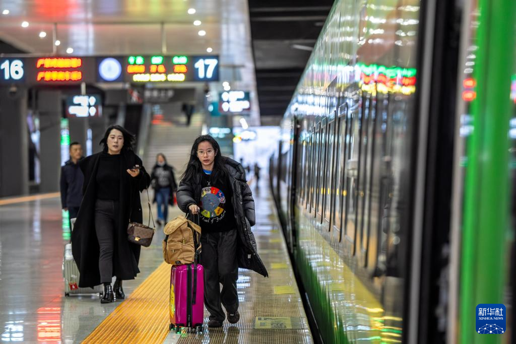 1月14日,乘坐D87次中老铁路国际旅客列车的旅客在昆明南站进站上车。新华社记者 胡超 摄