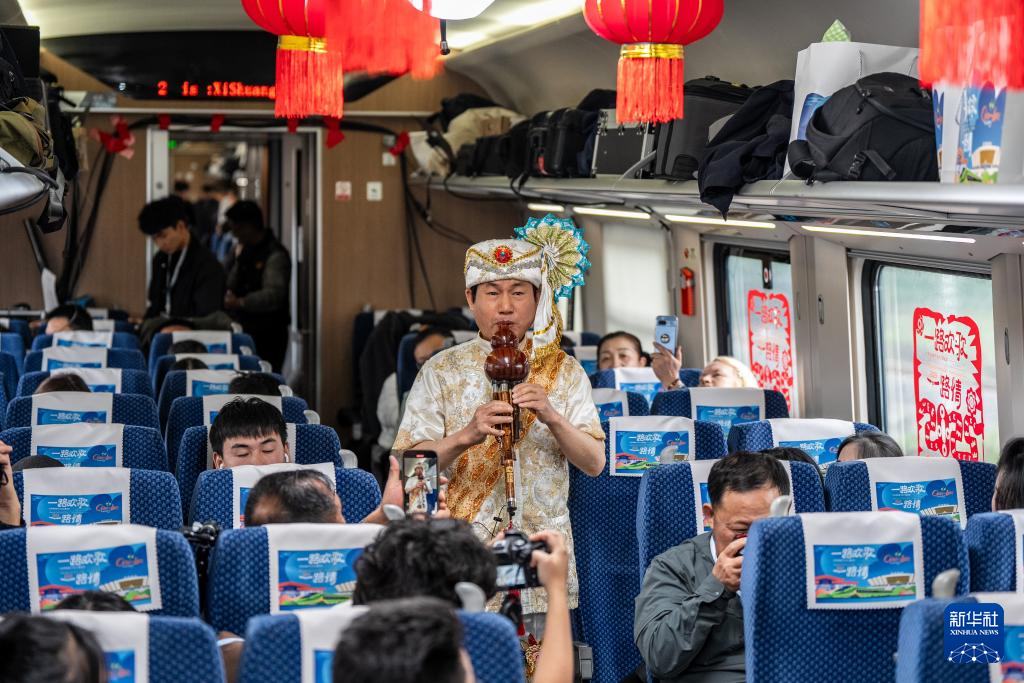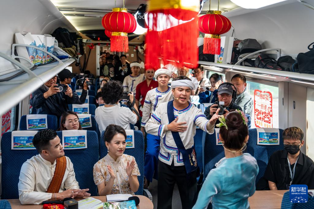 走进2号车厢,窗花鲜艳夺目,红灯笼映入眼帘,喜庆气氛感染着每一位旅客。“‘一路欢歌一路情’中老铁路春节文化主题活动十分特别。”云南省委宣传部副部长冯俊扬说,活动以春运首日中老铁路行进中的列车为舞台,端出精彩的跨国演出“大餐”,围绕中老铁路建设发展路、幸福路、友谊路,以快闪、文艺演出、世界遗产地宣介、非遗展示和主题故事分享等形式,讲好“跨国春运”暖心故事,奏响中老友谊之歌。