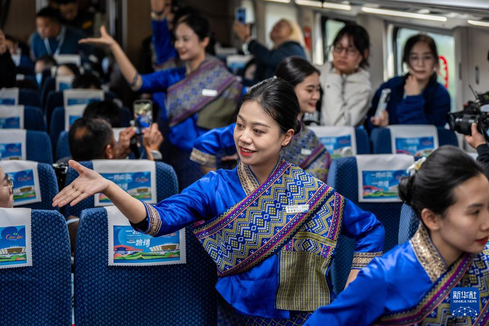 1月14日,中国铁路昆明局“金花列车员”在D87次中老铁路国际旅客列车上表演节目。新华社记者 胡超 摄