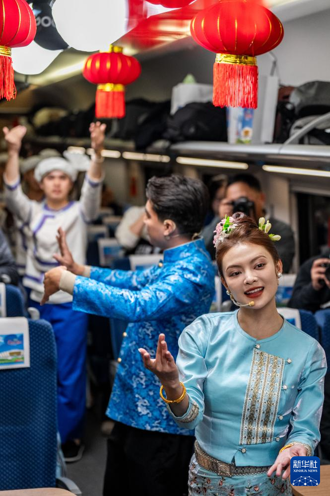 1月14日,西双版纳州民族文化工作团的演员在D87次中老铁路国际旅客列车上表演节目。新华社记者 胡超 摄