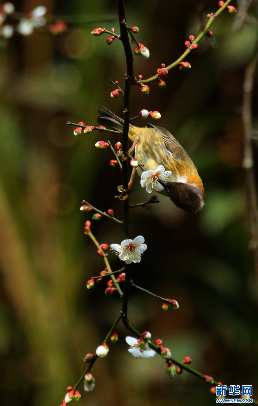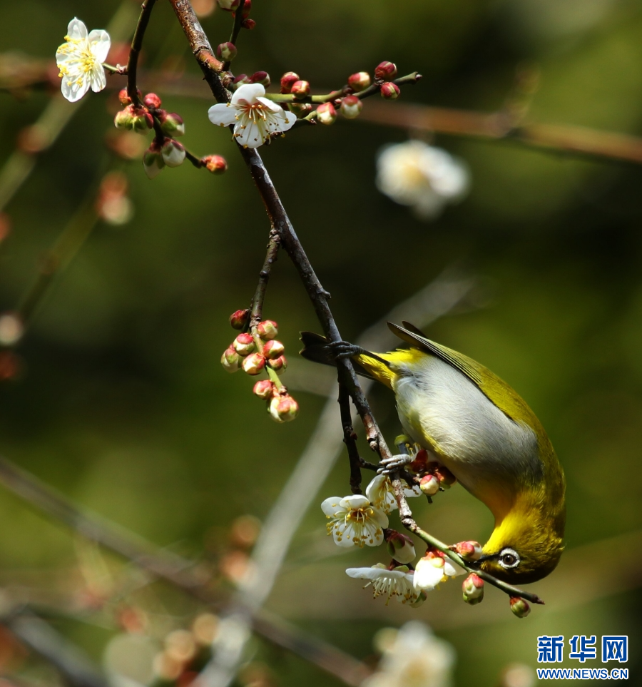 云南腾冲,梅花初绽,鸟儿嬉戏(1月13日摄)。新华网发(赵辉 摄)