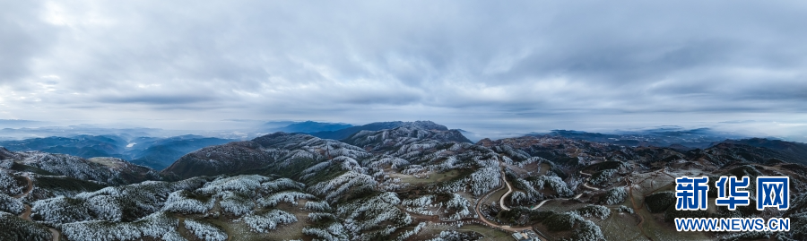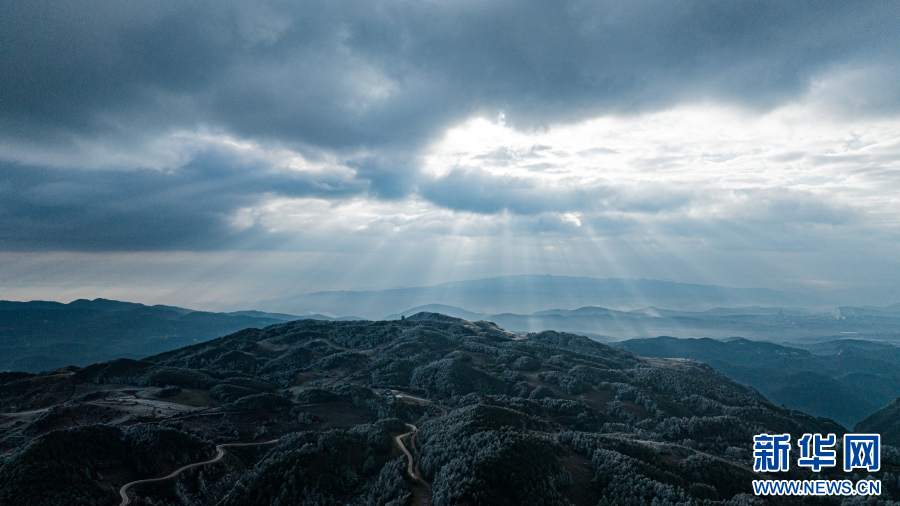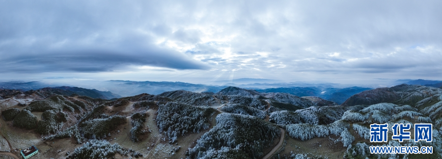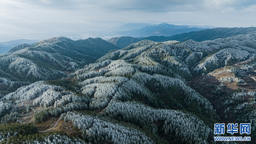 近日,受冷空气影响,云南梁王山迎来雾凇景观。清晨,当第一缕阳光洒在梁王山上,漫山遍野的树木都被雾凇包裹,枝头挂满晶莹剔透的冰花。寒风拂过,慢慢融化的雾凇纷纷扬扬洒落在树林之中。从空中俯瞰,连绵起伏的山林披上银装,十分壮美。新华网发(杨洪龙 曾颖颖 摄)
