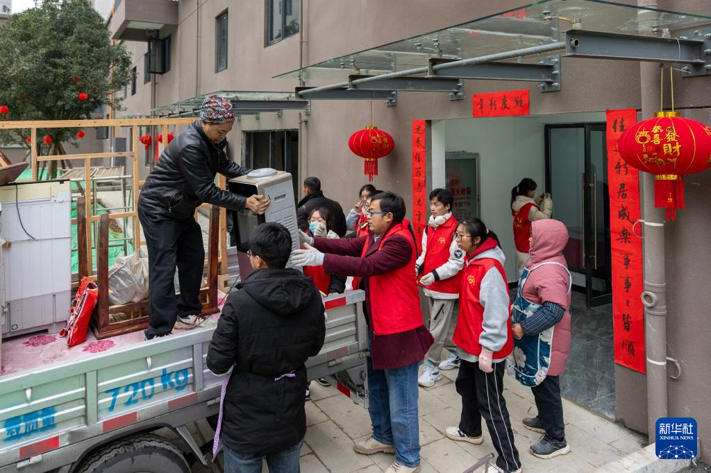 1月16日,志愿者在雄俊园小区帮助受灾村民搬家。新华社记者 陈欣波 摄