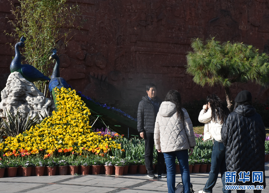 游客观赏丽江古城春花展并拍照留念(1月21日摄)。新华网发(和润仙 摄)