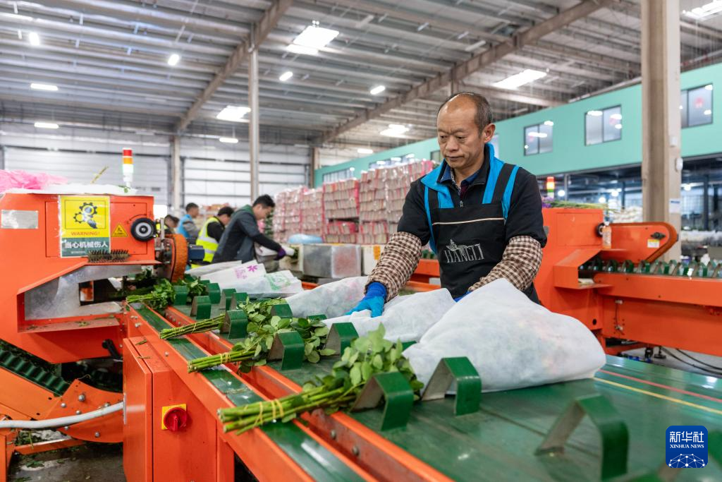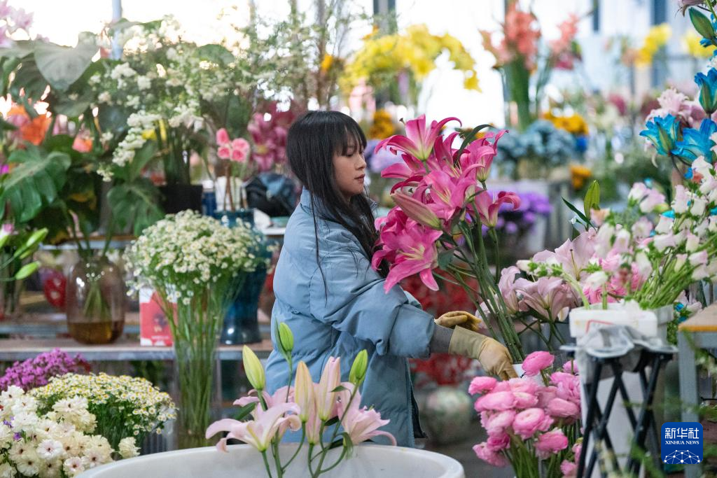 1月22日,一名工作人员在昆明云舍花卉有限公司流水线上摆放鲜花。