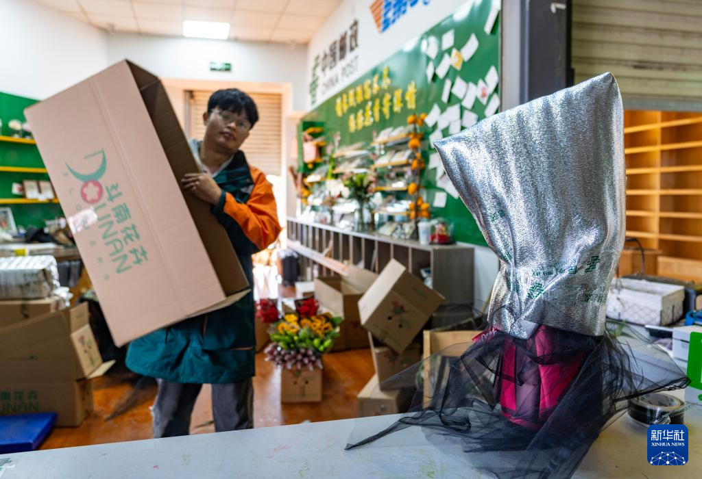 1月22日,一名快递人员在斗南花卉市场内准备将游客选购的鲜花打包发货。