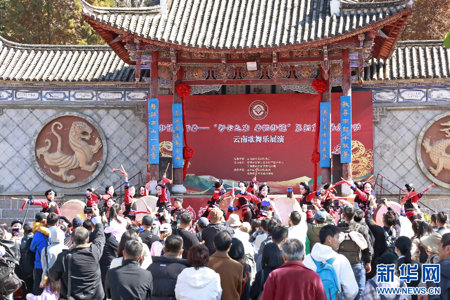众多游人驻足观看歌舞乐表演(1月23日摄)。新华网发(杨桢宇 摄)