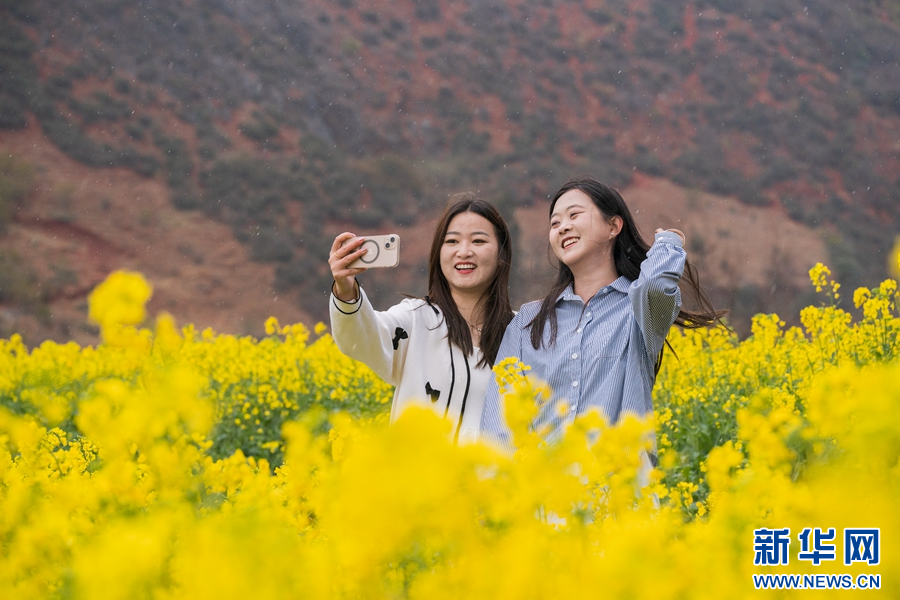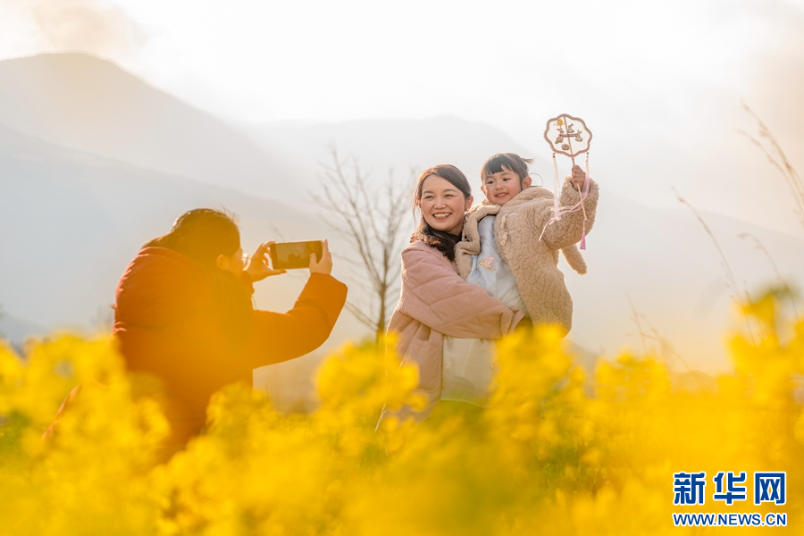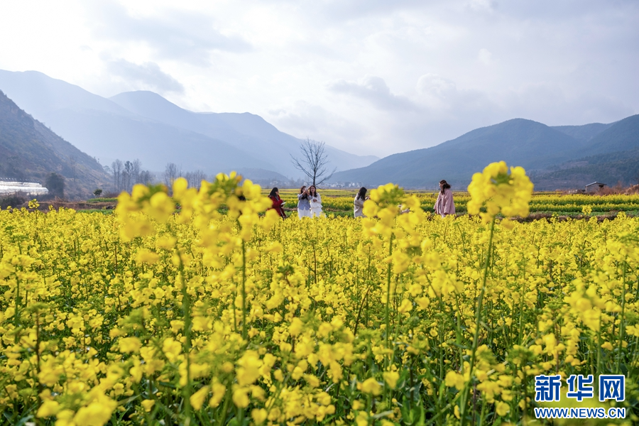 游客在洱源县凤羽古镇的油菜花田里拍照(摄于2月16日)。新华网发(罗新才 摄)