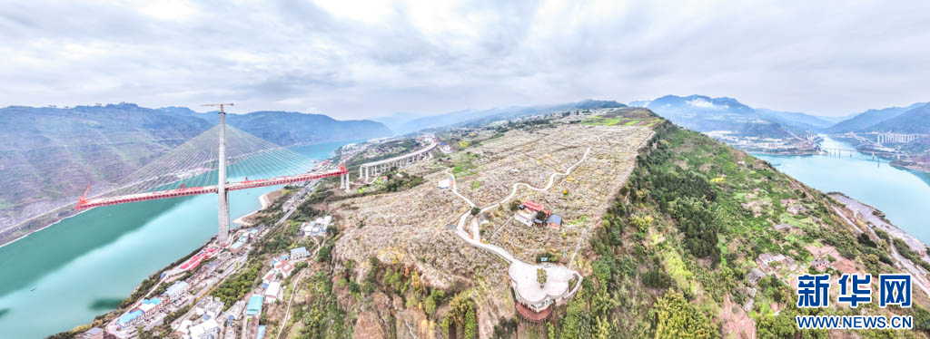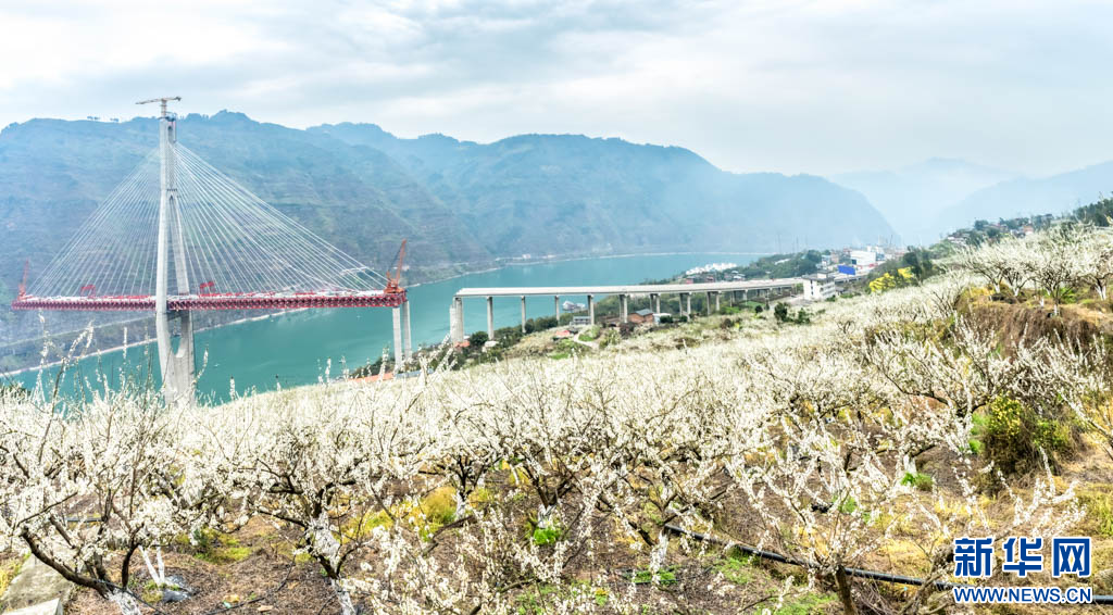 李花与远处的金沙江及在建的桥梁交织如画(3月12日摄)。新华网发(曾三东 摄)