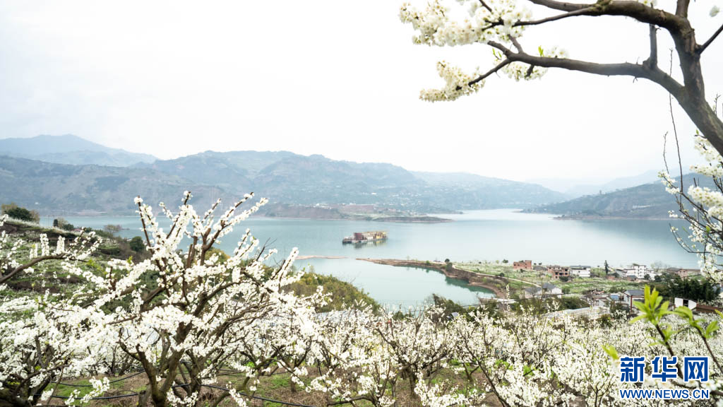 漫坡李花与远处的金沙江及在建的桥梁交织如画(3月12日摄)。新华网发(曾三东 摄)