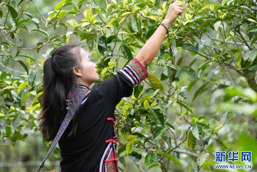 茶农李如萍正在采茶(3月17日摄)。新华网发 (景谷县融媒体中心供图)