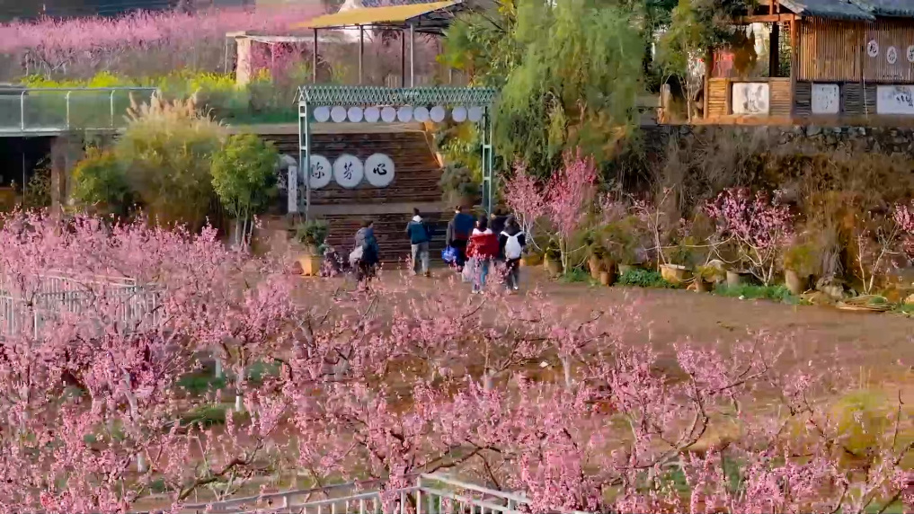 昆明游客哏流娅说:“我们几乎每年都来,原来的小路是走村串寨,现在很好,有了一条直通大道,今年才修通的。这一片桃园紧邻着茈碧湖,看出去的话那就是水天一色,让人心情特别愉悦。”