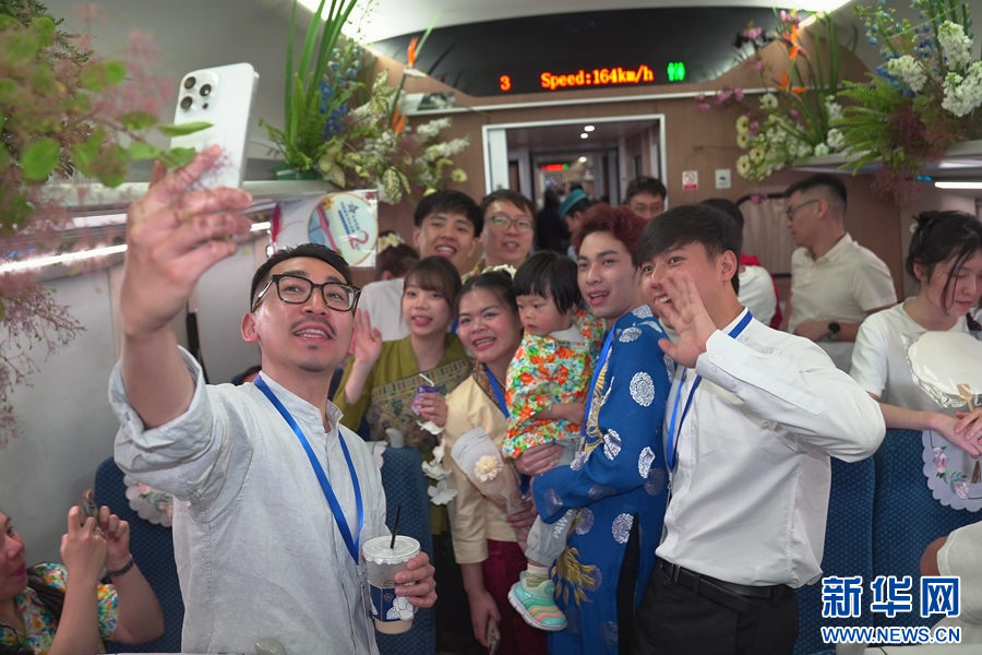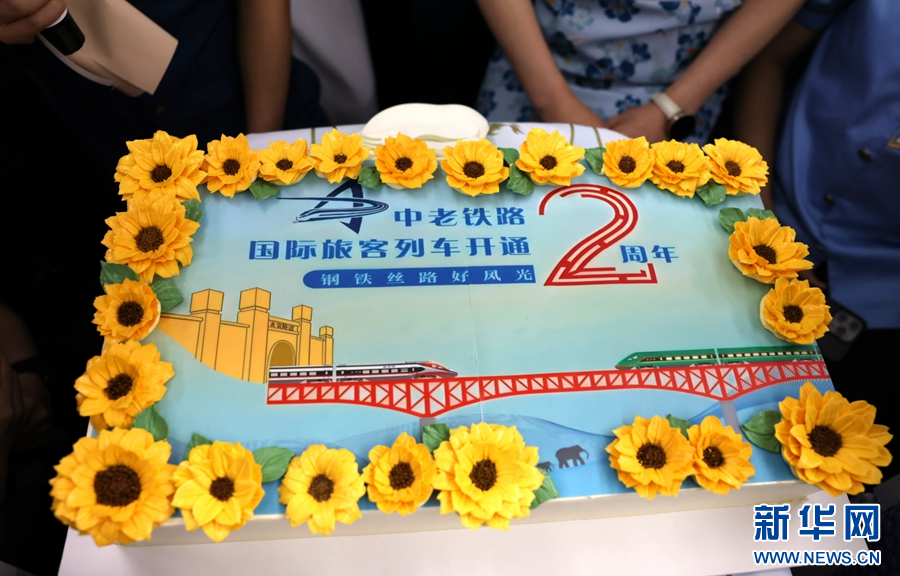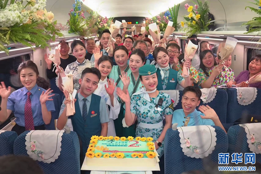 4月12日,D87次国际旅客列车上,工作人员与旅客欢庆中老铁路国际旅客列车开行两周年。新华网发(周涛 摄)