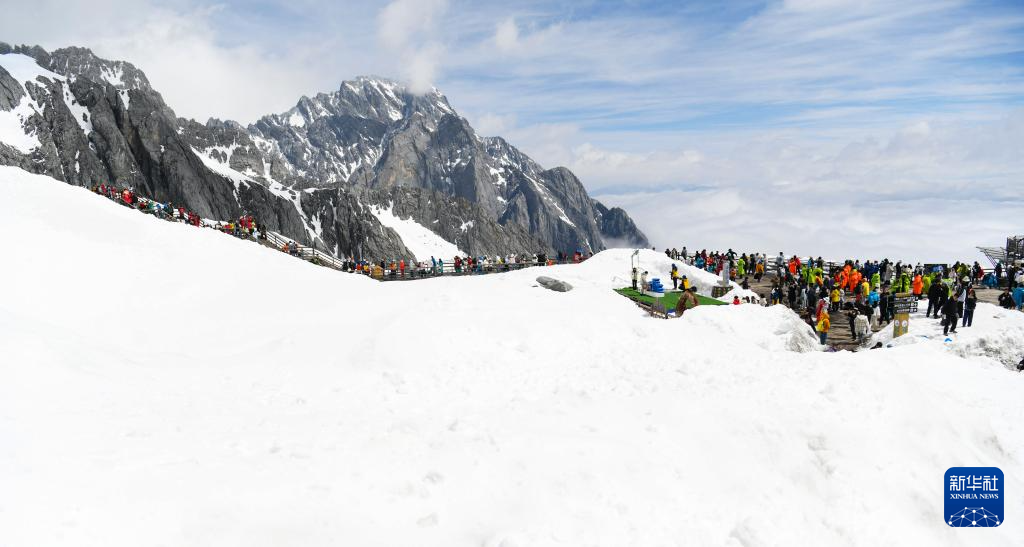近日,云南丽江玉龙雪山春雪云海同框,景色壮美,吸引众多游客前来游玩。