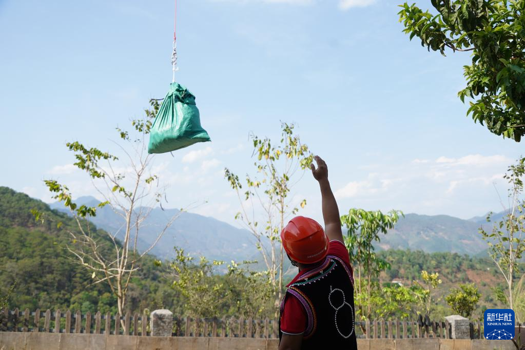4月14日,昔归村茶农准备取下无人机运回的茶叶鲜叶。新华社发(金维娜 摄)