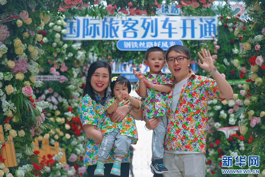 4月12日,中老铁路磨憨站,旅客留影。新华网发(周涛 摄)