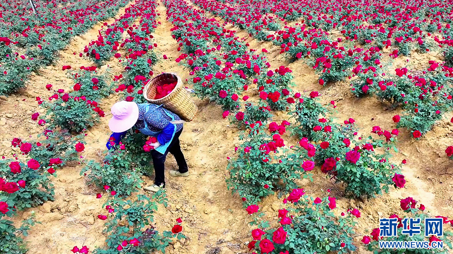 花农采摘玫瑰花(4月20日摄)。新华网发(丘北县融媒体中心 供图)