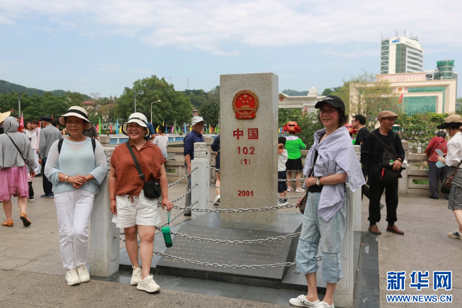 游客在界碑前拍照留念(5月2日摄)。新华网发(薛莹莹 摄)