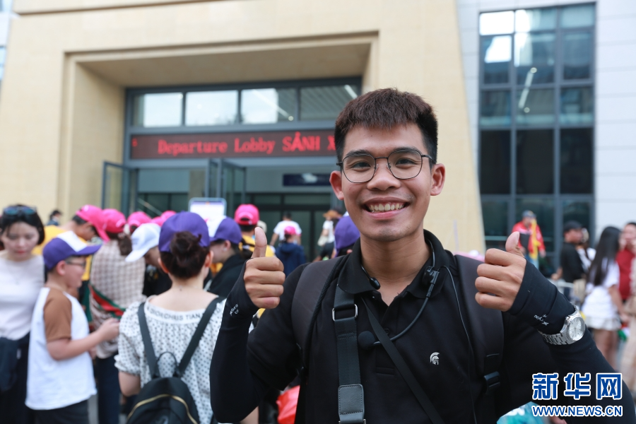 在中国河口公路口岸南溪河联检大楼前,一名越南游客对着镜头点赞(5月2日摄)。新华网发(薛莹莹 摄)