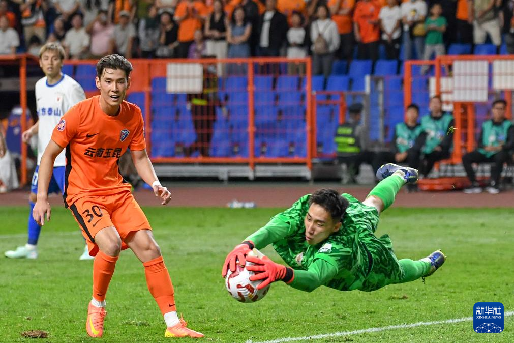 5月5日,山东泰山队守门员于金永(右)在比赛中扑救。新华社发(彭奕凯 摄)