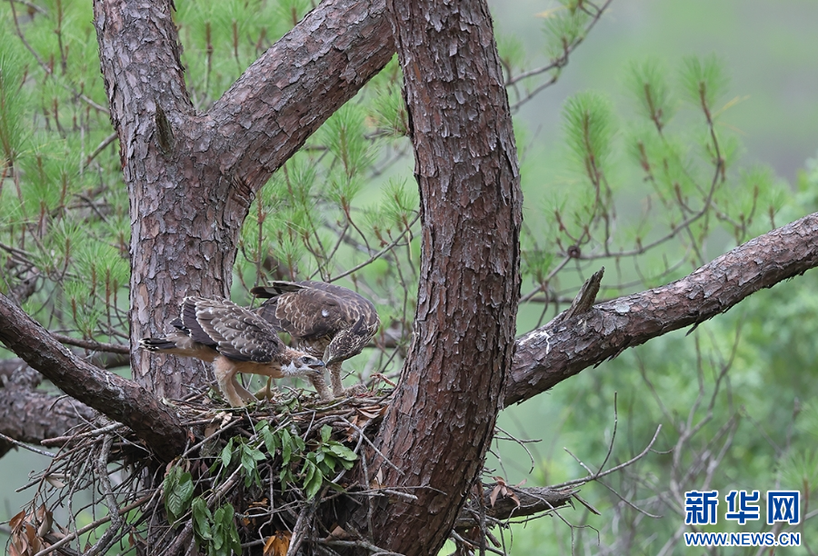 凤头鹰雕“鸟妈”把食物撕碎喂给雏鸟(5月19日摄)。新华网发(杨学飞 摄)