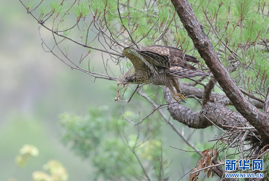 凤头鹰雕 “鸟妈”清扫鸟巢,把猎物骨头叼走(5月19日摄)。新华网发(杨学飞 摄)