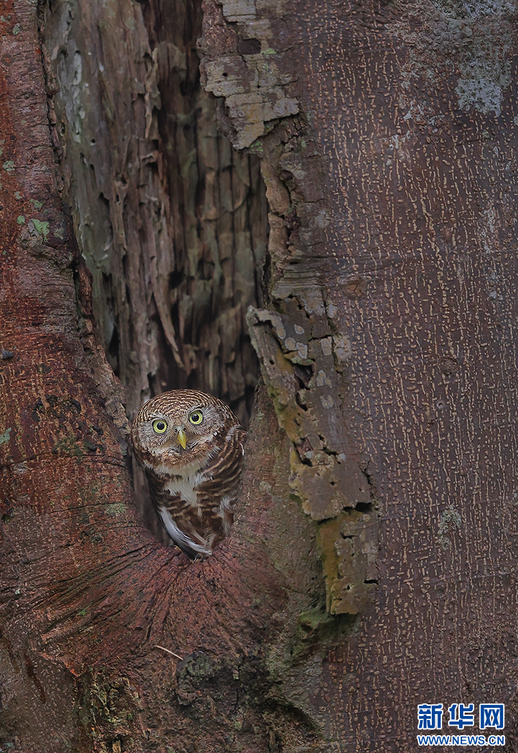 斑头鸺鹠在树洞口警惕张望,保护雏鸟(5月20日摄)。新华网发(杨学飞 摄)