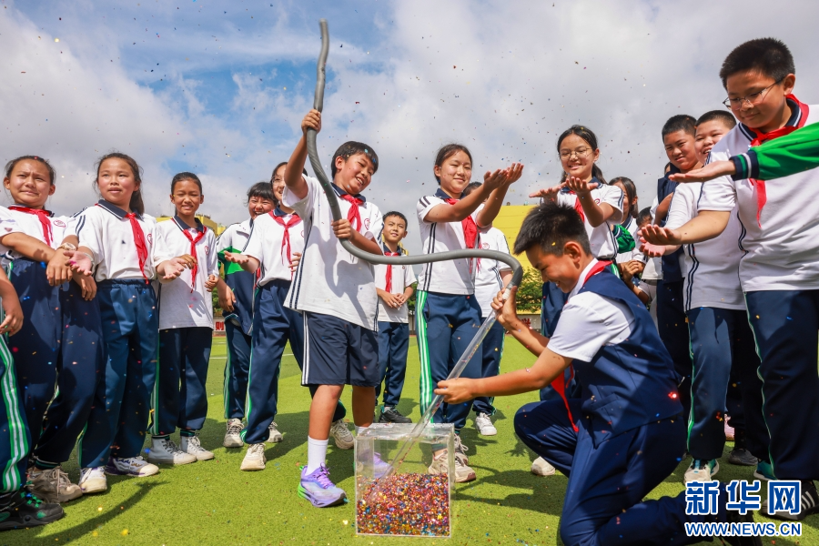 在云南省开远市东城小学“六一玩转科技 童心趣闯未来”主题活动中,五年级学生们利用流体力学洒落箱子里的彩屑(5月30日摄)。新华网发(陶家淇 摄)