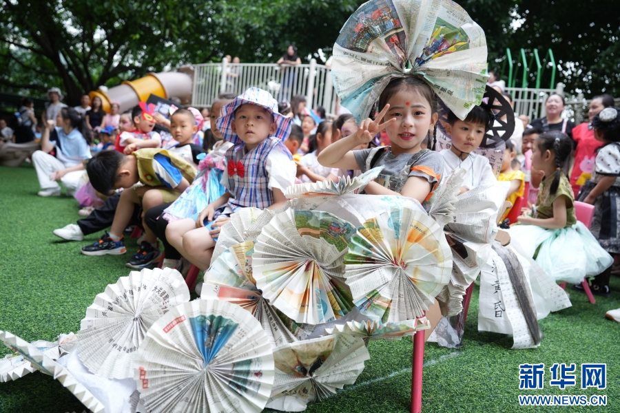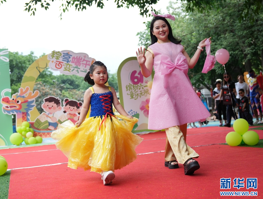 云南省水富市一幼儿园举办亲子环保时装秀迎“六一”(5月29日摄)。新华网发(狄廷秀 摄)
