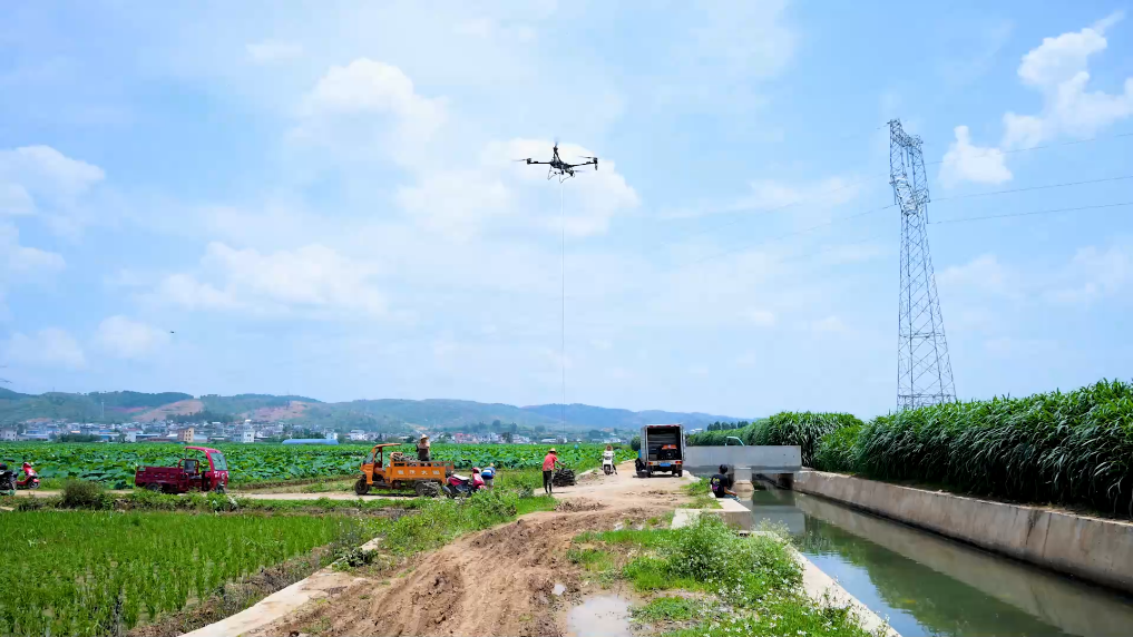 在万亩莲藕种植基地,一架架农业无人机穿梭于藕田之间,将新鲜采摘的莲藕吊运至田边的集散点。