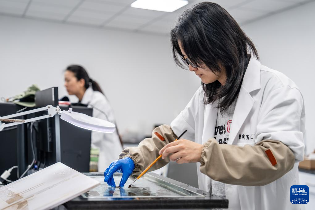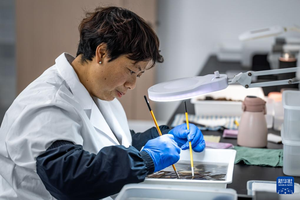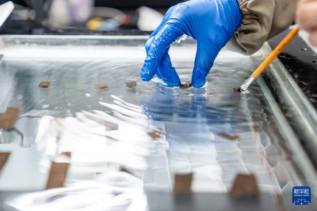 云南省文物考古研究所工作人员在清理木简(2025年4月24日摄)。新华社记者 胡超 摄