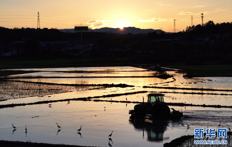 云南省腾冲市和顺镇,农机忙碌,白鹭翩跹(6月15日摄)。新华网发(龚祖金 摄)
