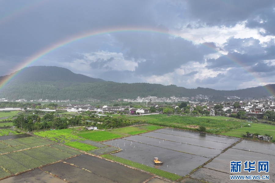 彩虹下的云南省腾冲市和顺镇田园风光(6月15日摄)。新华网发 (龚祖金 摄)