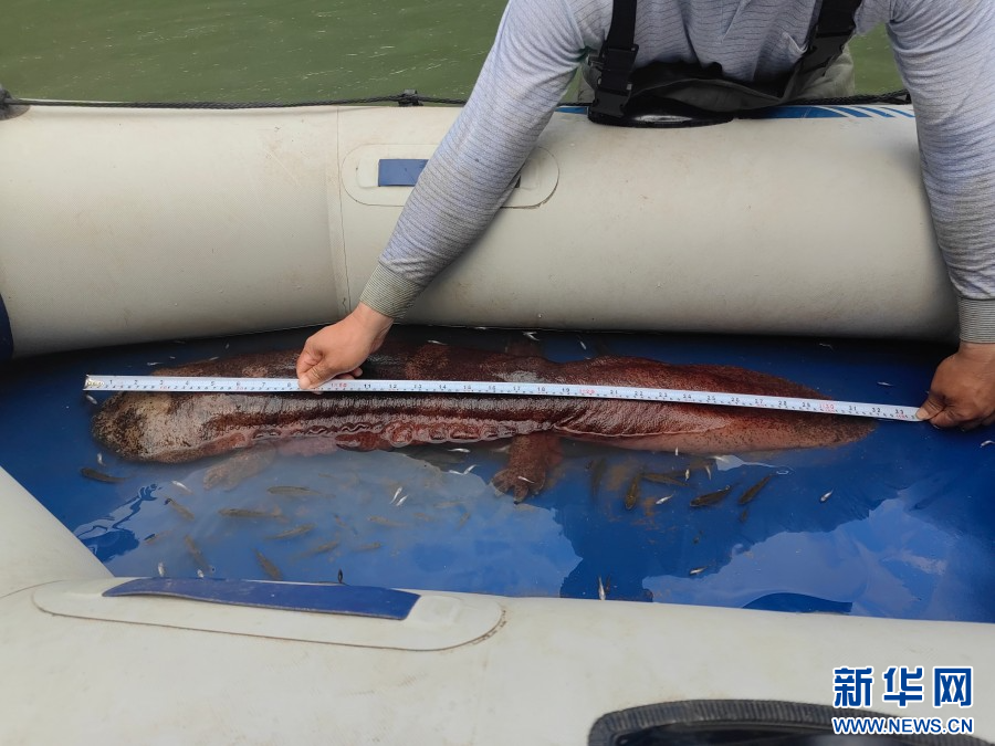 测量娃娃鱼体长(6月14日摄)。新华网发(昭通市融媒体中心供图)