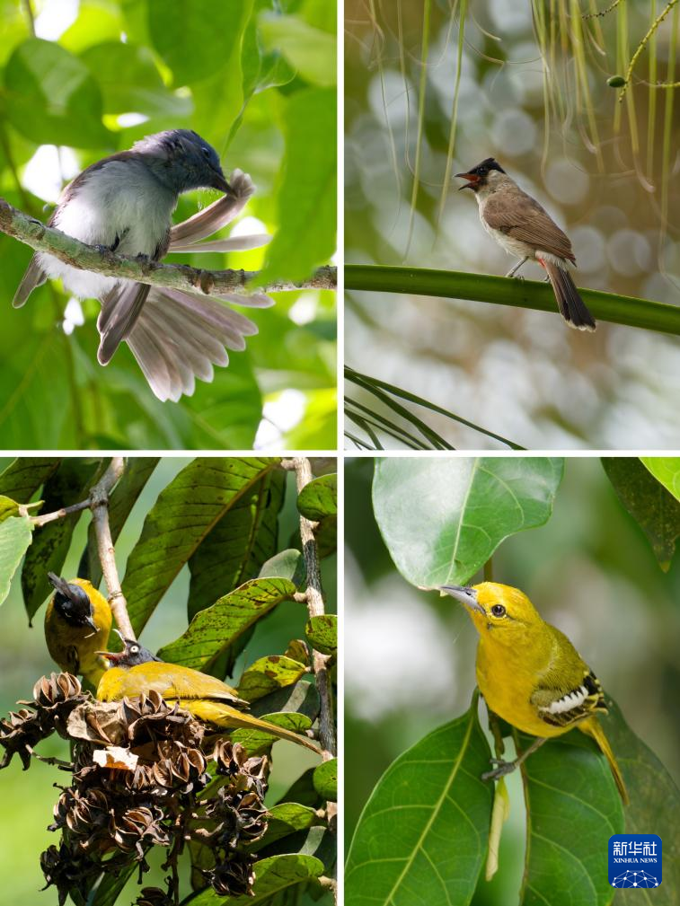 拼版照片:左上为黑枕王鹟;右上为白喉红臀鹎;左下为黑冠黄鹎;右下为黑翅雀鹎(6月15日摄于中国科学院西双版纳热带植物园)。新华社记者 高咏薇 摄