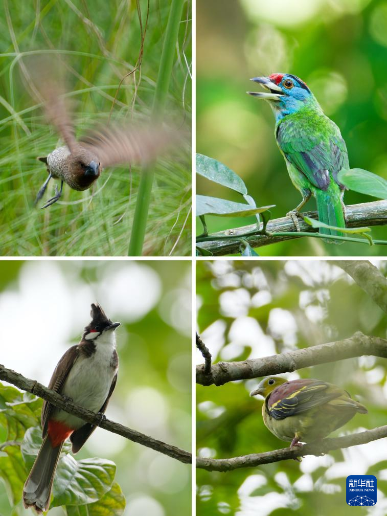 拼版照片:左上为斑文鸟;右上为蓝喉拟啄木鸟;左下为红耳鹎;右下为灰头绿鸠(6月15日摄于中国科学院西双版纳热带植物园)。新华社记者 高咏薇 摄
