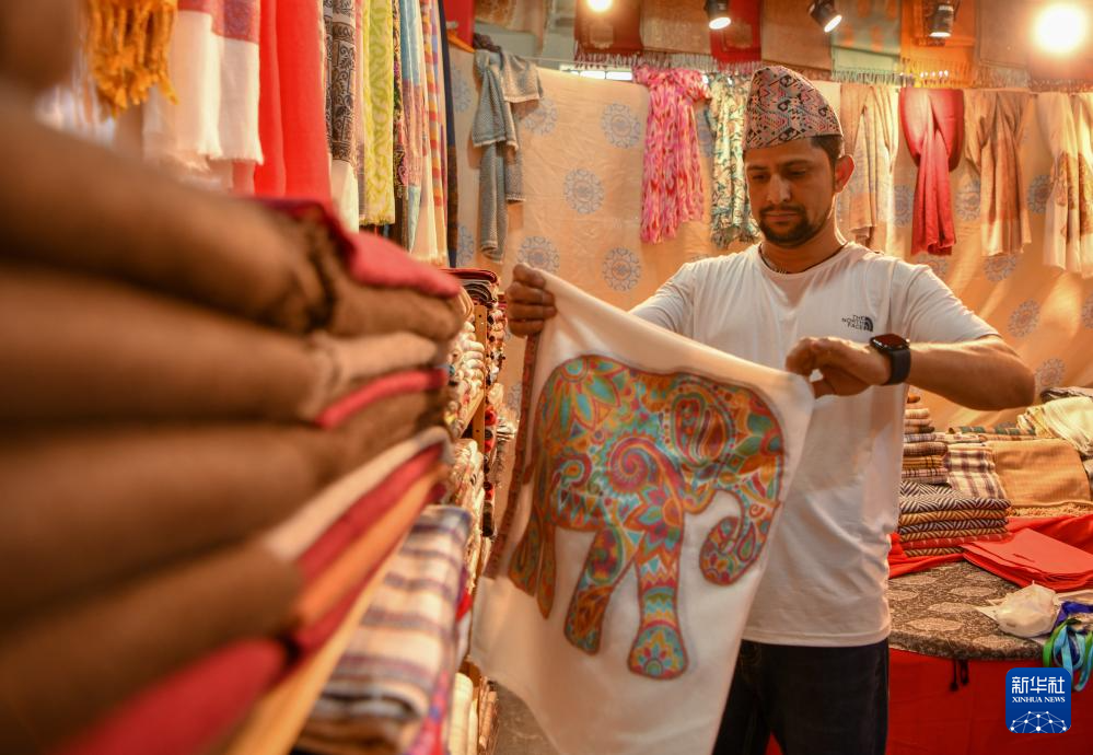 6月18日,来自尼泊尔的参展商整理即将展出的特色服饰。新华社发(彭奕凯摄)